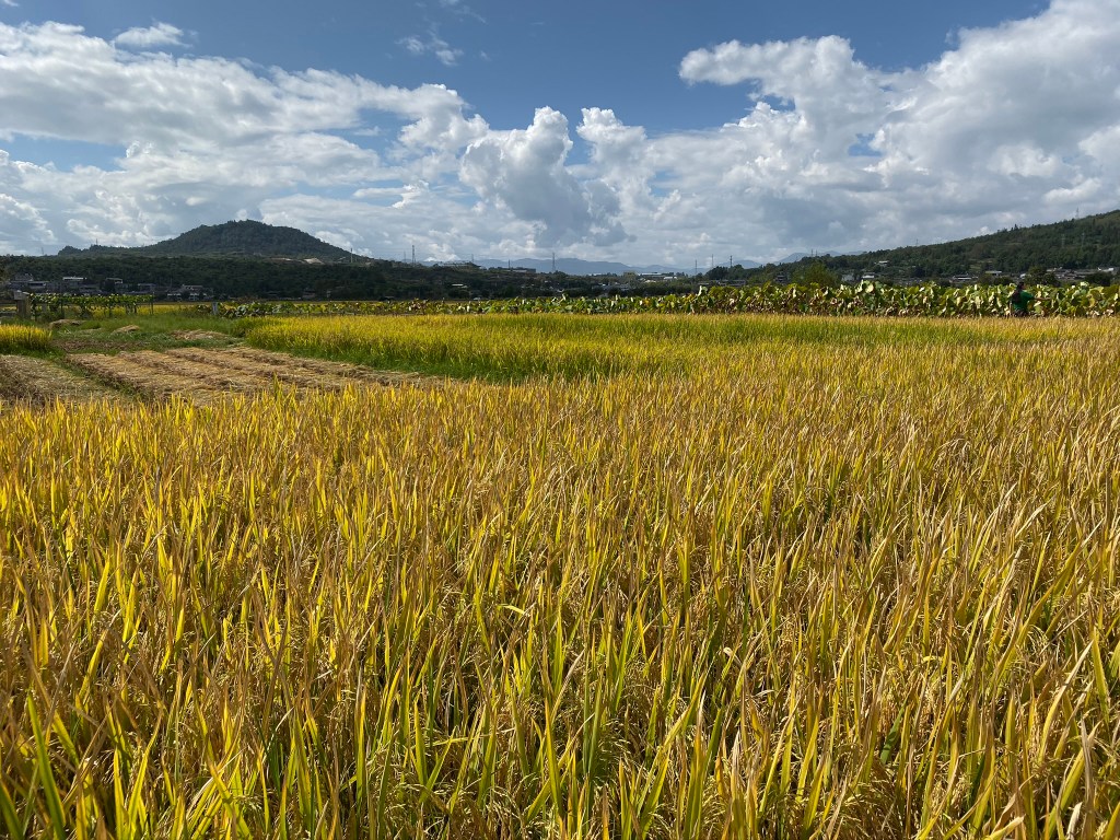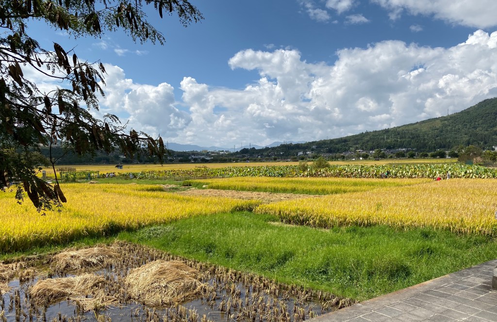 I missed a sensational photo op, thanks to Fear of Falling Into the Muck. The extremely narrow path, which was made of bumpy chunks of grassy earth and lined by nothing more than flimsy rice stalks, could offer no guarantee of safe passage. For me, at 53 years of age with osteoporosis, a bad knee, and an extreme dislike of being wet and/or muddy, traversing this path was a definite no. (Did I mention, extremely narrow? And uneven/unsure footing, with nothing solid to hold onto to prevent a fall?) But plenty of others—including my family—braved the trails and filled their cameras with rice field photo bounty.