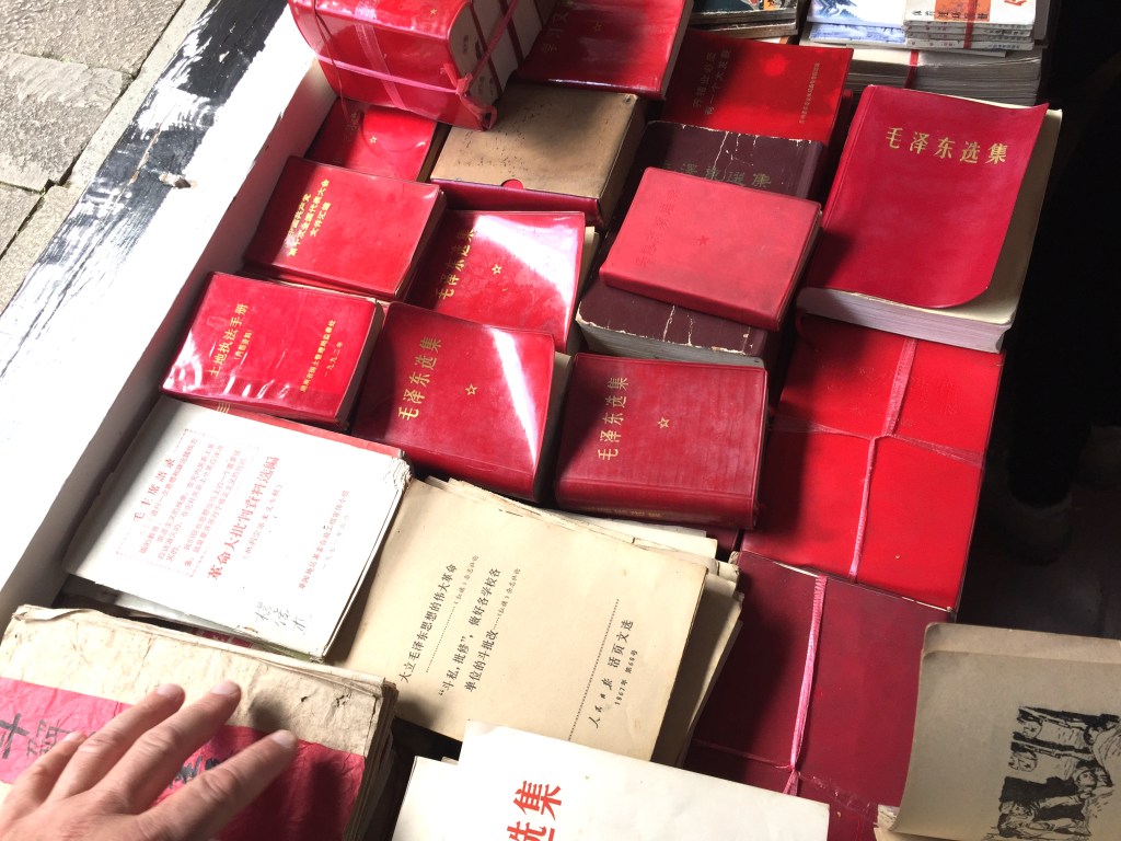 A table full of vintage Chinese paperbacks.And off to the side, requisite red books (also vintage).